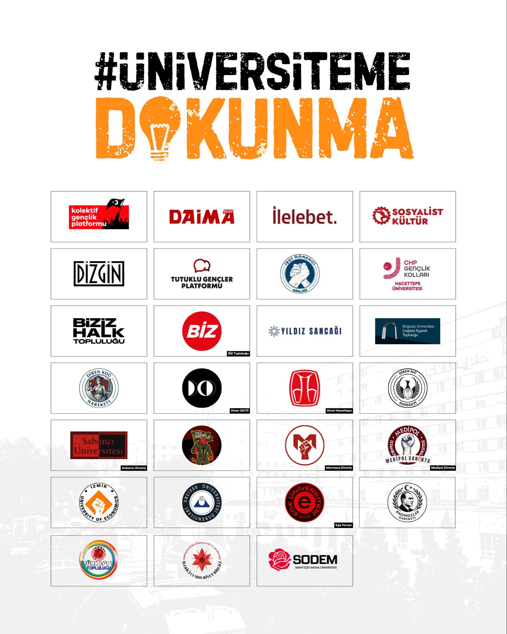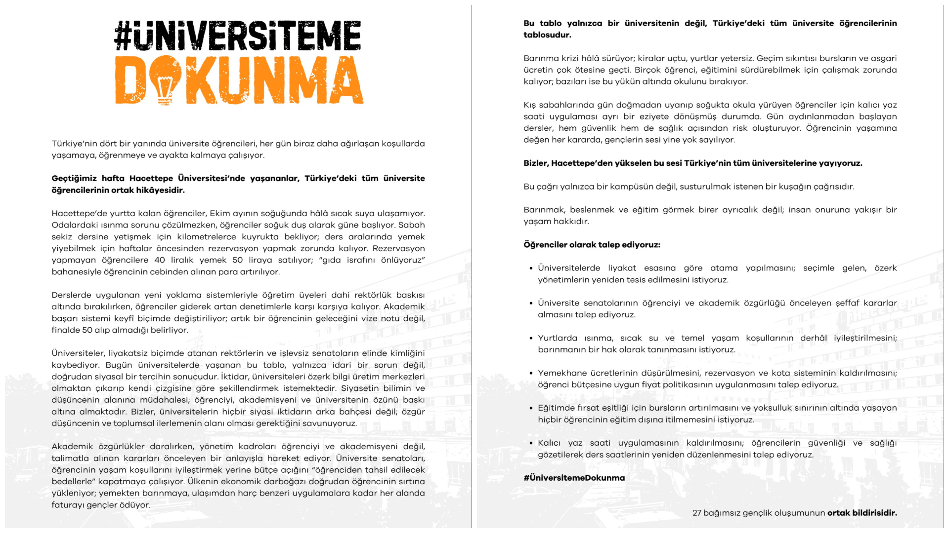 #ÜniversitemeDokunma adı altında 27 bağımsız gençlik oluşumu ortak bir bildiri yayınladı ve Türkiye genelinde üniversite öğrencilerinin her geçen gün artan zorluklarla mücadele ettiğini ifade etti. Bildiride, “Hacettepe Üniversitesi’nde yaşananlar, Türkiye’deki tüm üniversite öğrencilerinin ortak hikayesidir” denildi.