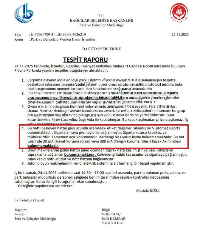 • Çarpılma olayının iddia edildiği park işletmecisine ait oyun makinelerinde yapılan tespitte, basketbol sahasının yanında bir adet jetonlu araba, bir adet jetonlu motor ve bir adet jetonlu boks makinesi olarak, toplamda üç cihazın bu hatta bağlı olduğu tespit edilmiştir.