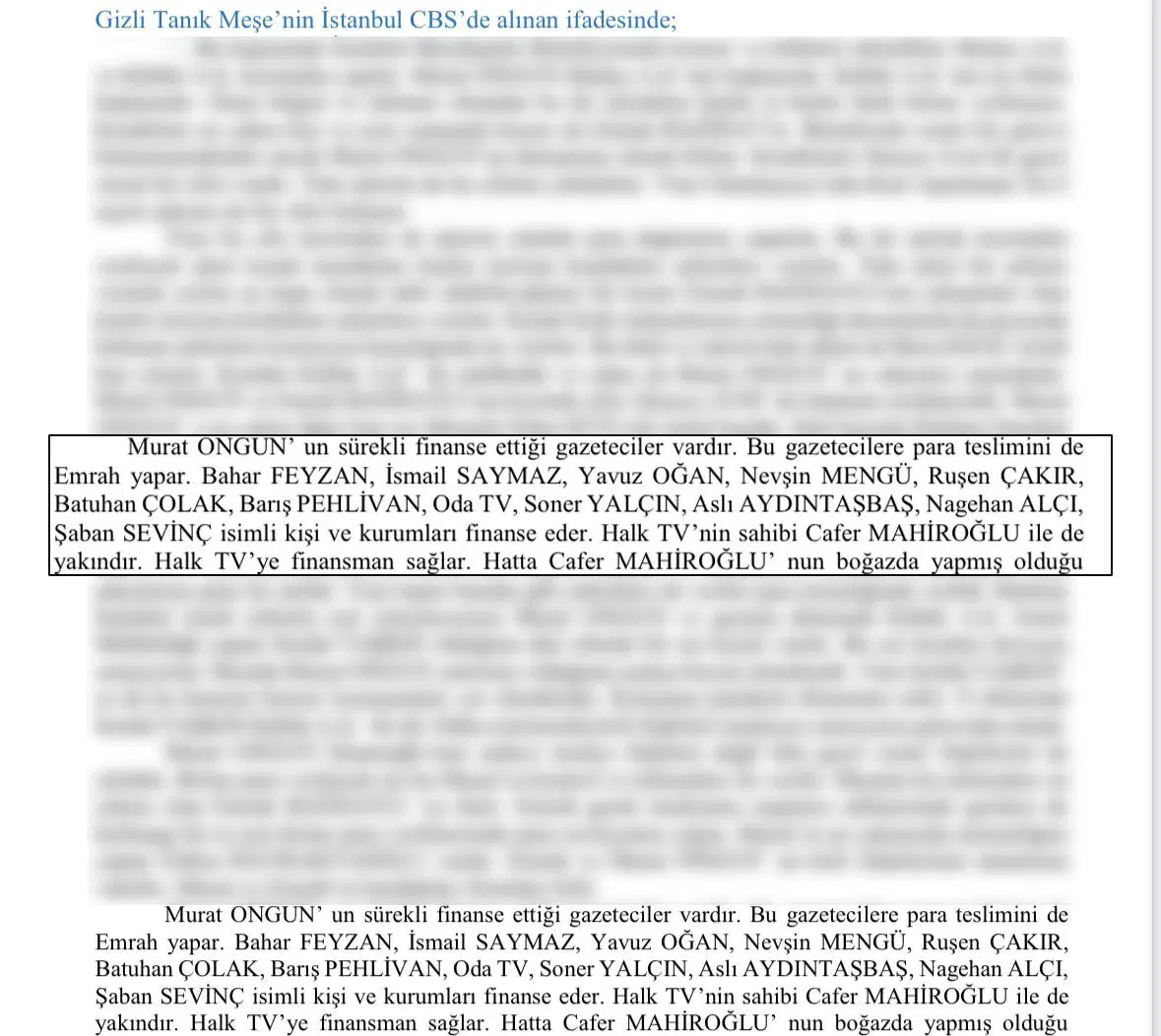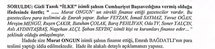 Gizli tanık Meşe, ifadelerinin bir bölümünde çeşitli gazetecilerin ve medya kuruluşlarının İBB Danışmanı Murat Ongun tarafından finanse edildiğini, paraların tesliminin ise Emrah Bağdatlı tarafından yapıldığını da öne sürmüştü.