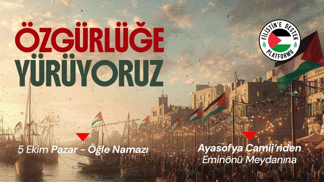 Bugün, 5 Ekim 2025 Pazar günü, öğlen namazının ardından Ayasofya Camii’nde toplanacak olan katılımcılar, Eminönü Meydanı’na yürüyecek ve Gazze’ye destek için çeşitli sloganlarla Filistin halkına dayanışma mesajı verecekler.
