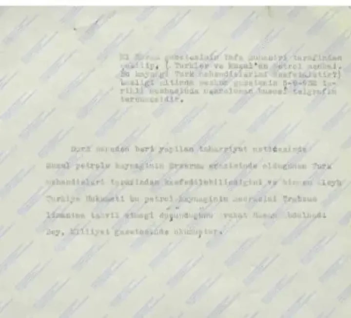 Belgeye göre, Musul petrollerini besleyen ana damarlar Erzurum topraklarından başlıyor ve o dönemde Türk mühendisler tarafından tespit edilmişti. Bu bilgi, 5 Eylül 1932 tarihinde Mısır’ın köklü gazetesi AlAhram tarafından yayımlandı. Gazetenin Yafa muhabirinin haberinde şu ifadeler yer aldı: “Türkler ve Musul Petrol Menbaı – Bu Kaynağı Türk Mühendisler Keşfetmiştir.”