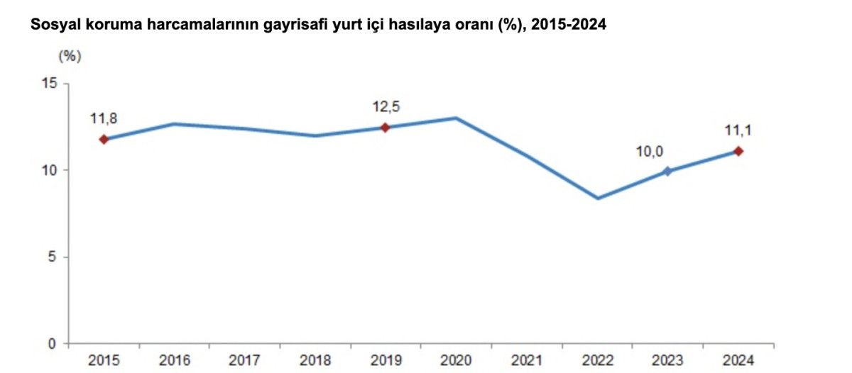 Sosyal koruma harcaması 2024 yılında bir önceki yıla göre yüzde 84,1 artış göstererek 4 trilyon 964 milyar 532 milyon TL oldu.